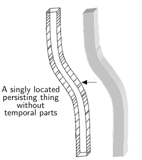 The picture that emerges is one of a three-dimensional object in a certain locative relation to different time instants. The illustration below appears in (Gilmore, Calosi, and Costa 2024).